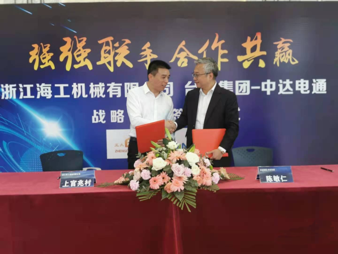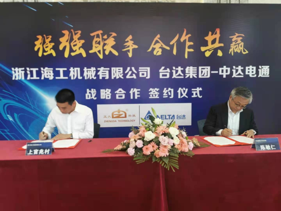 機械與工控強強聯手,海工與臺達合作共贏。4月23日,浙江海工機械一樓大廳熱鬧非凡,海工機械總經理上官兆村與臺灣臺達集團-中達電通機電事業(yè)部總經理陳敏仁在此簽訂戰(zhàn)略合作協(xié)議。